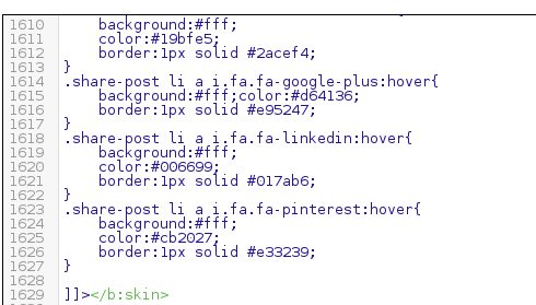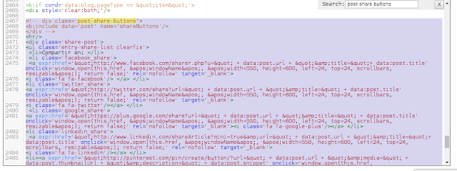 Éstas etiquetas, pegarlas después del segmento de código de los botones de compartir por default que vienen con blogger, de nuevo, utilizar el buscador Ctrl+f, para buscar la línea, el segmento es parecido al siguiente: