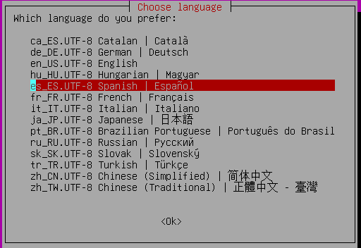 Seleccionar el idioma de tu preferencia, en este caso seleccioné el español. Para bajar o subir, utilizar las flechitas del teclado, para seleccionar presionar enter, para saltar a otro botón presionar tab.