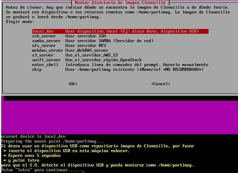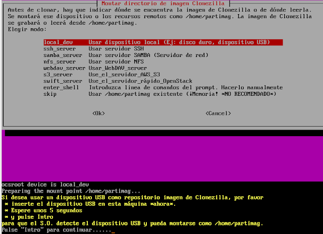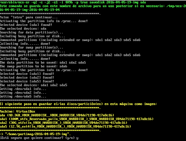 Al presionar enter en esta sección, nos mostrará un mensaje en color amarillo, lo cual indica, que si queremos guardar la imagen en un dispositivo externo usb/hdd, externo que se conecte justo en este paso. Y así lo hacemos, lo conectamos y a continuación presionar enter. Ojo, no le pasará nada al disco duro en el que lo guardemos, recordar que solo es la imagen, no es que se esté clonando.