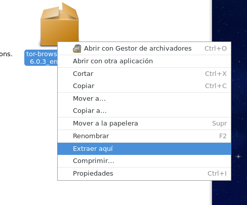 Y con esas utilidades abrir Nautilus y dar clic derecho sobre el archivo descargado de tor y seleccionar la opción de <Extraer aquí>. Como ejemplo lo extraje en la ruta Descargas de su directorio personal.