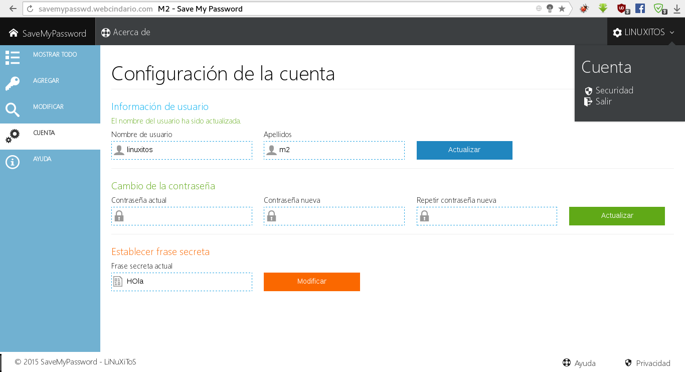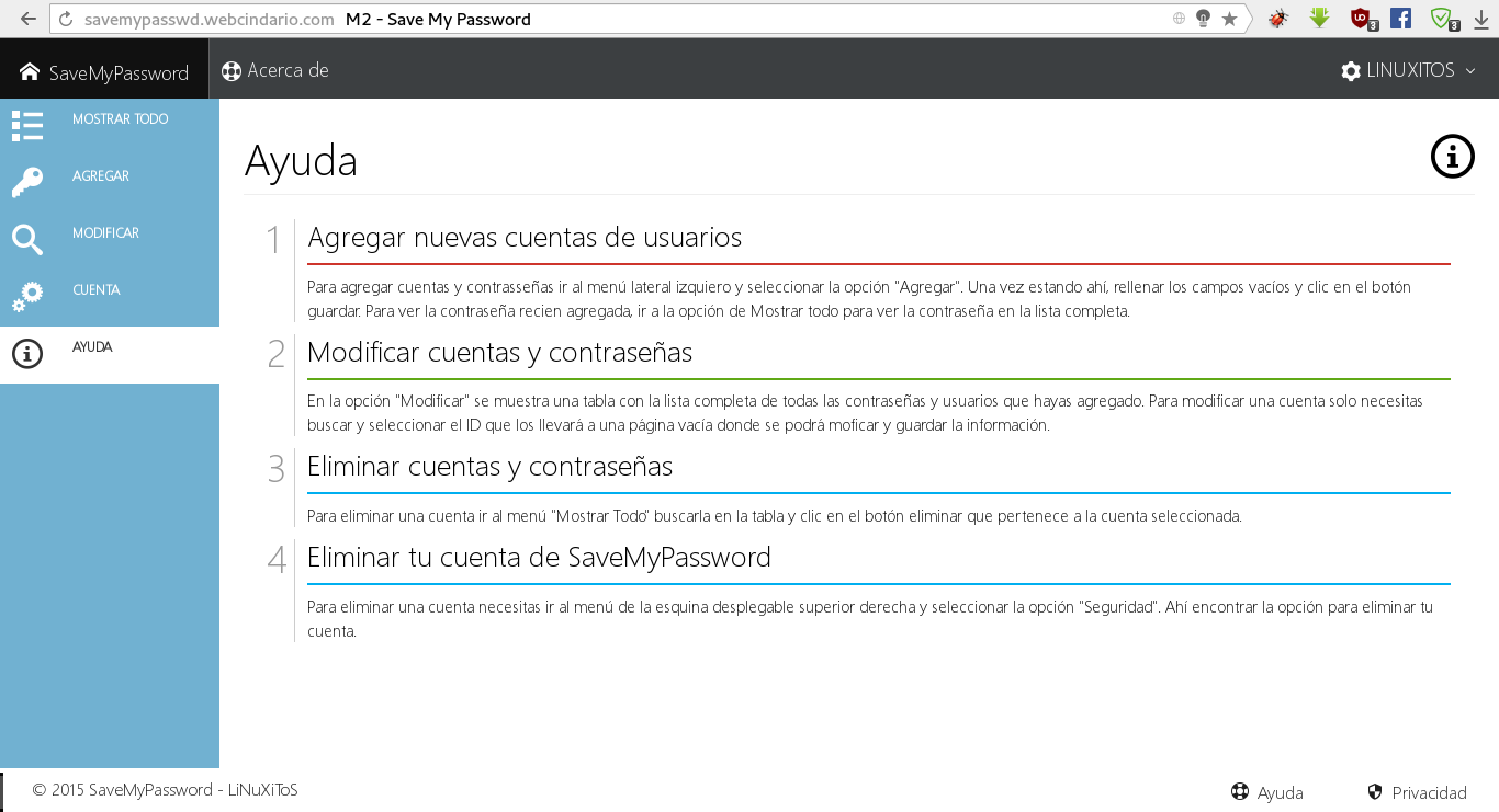 SaveMyPassword es un sitio web en dónde puedes guardar tus nombres de usuario y contraseña en la nube. De tal modo que puedas acceder a ellas con una sola contraseña maestra. En este sitio puedes agregar, borrar, actualizar fácilmente todas las contraseñas y usuarios que tengas. Nunca más olvides tus contraseñas, mantenlas todas en un solo lugar.