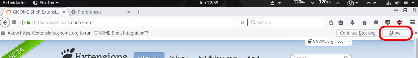 Una vez que se accede al sitio https://extensions.gnome.org web que le pedirá por Firefox para permitir la integración de shell de GNOME se mencionó anteriormente. Cli en permitir y recordar.