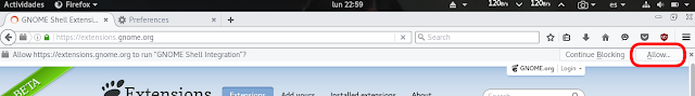 Hay dos formas de obtener una extensión para GNOME Shell. La primera forma es a través de su página web: https://extensions.gnome.org Debido a que el sitio Web utiliza las extensiones de funcionalidad especial plugin, se debe acceder a ella mediante el navegador web Mozilla Firefox. Una vez que acceda al sitio verá un mensaje para permitir la integración de shell de GNOME. Una vez autorizado, se le pedirá Permitir Ahora o Permitir y recordar la decisión.