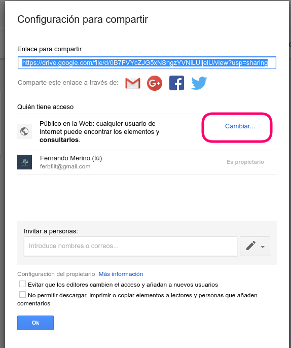 <Clic en Cambiar...> Y permitir de acceso acceso público para que pueda ser visto por cualquer.