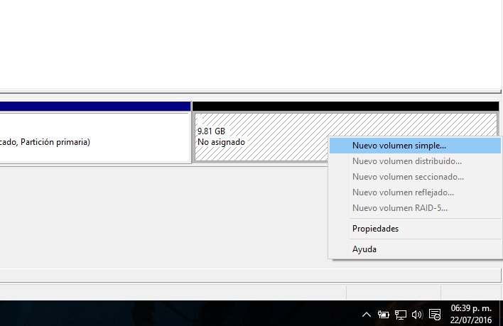 Clic derecho sobre la partición, seleccionar Nuevo volumen simple.