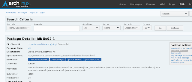 Primero, hay que buscar y descarjar el JDK desde la página de AUR Arch, ya que es necesario empaquetar uno mismo el paquete completo: