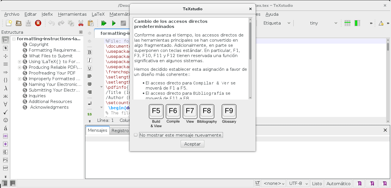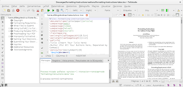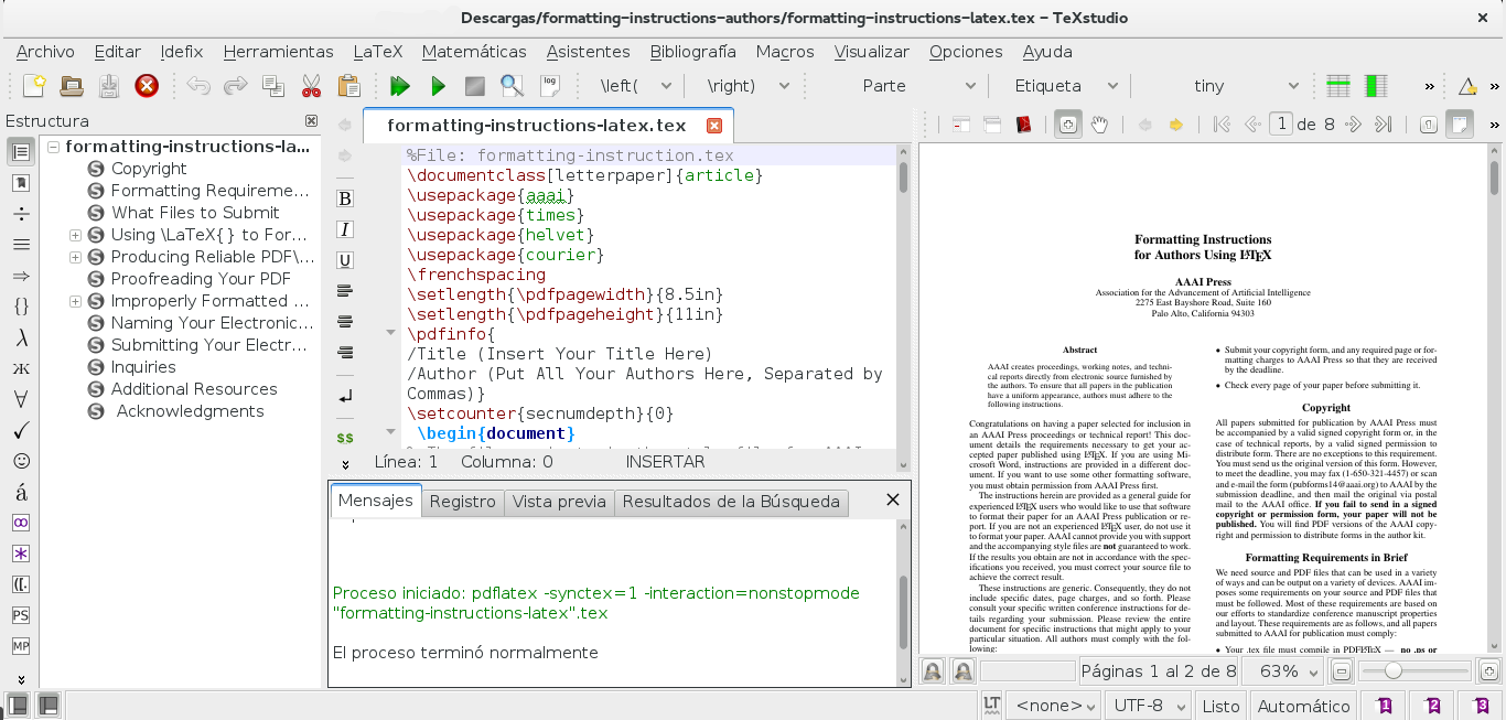 Abrir el archivo formatting-instructions-latex.tex con Texstudio, a continuación aparecerá así: