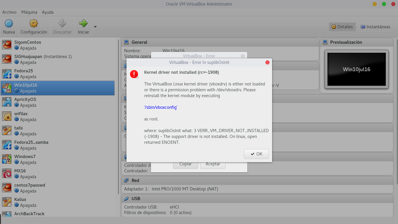 Al ejecutar el comando, en fedora lanzará una alerta de SELinux, con instrucciones que se ejecutarán en la terminal para que funcione. Esto dependerá de la versión de VB y el kernel.