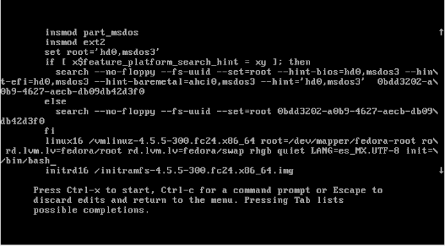 Ahora agregar init=/bin/bash al final de la línea del boot que comienze con cualquiera de las siguiente opciones: