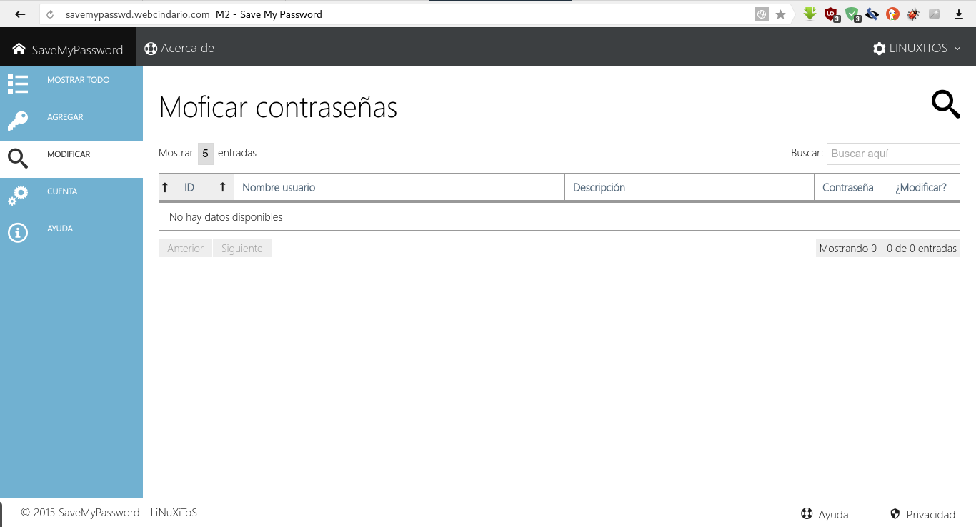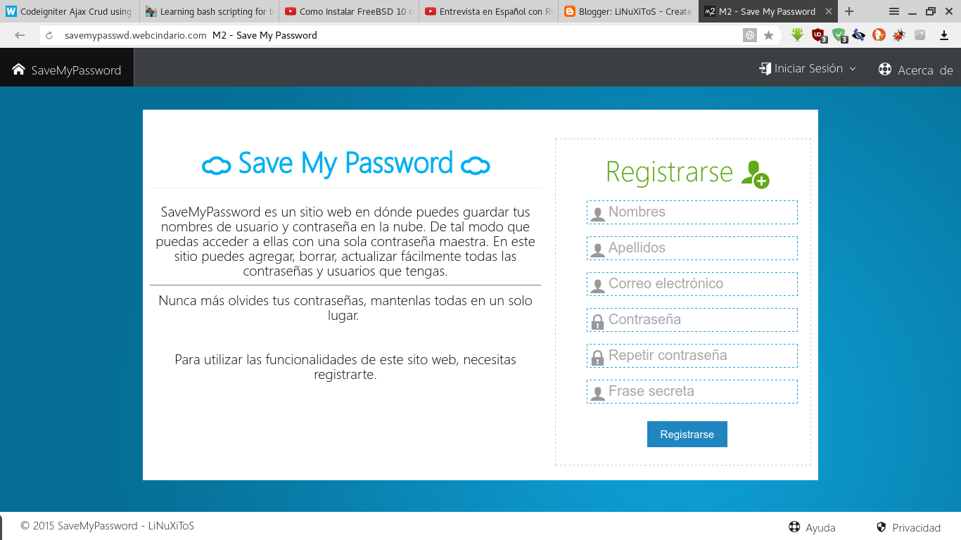 SaveMyPassword es un sitio web que he desarrollado como ejemplo completo, en el uso de MySQL y PHP. Este sitio es para guardar nombres de usuario y contraseñas por cada usuaro.